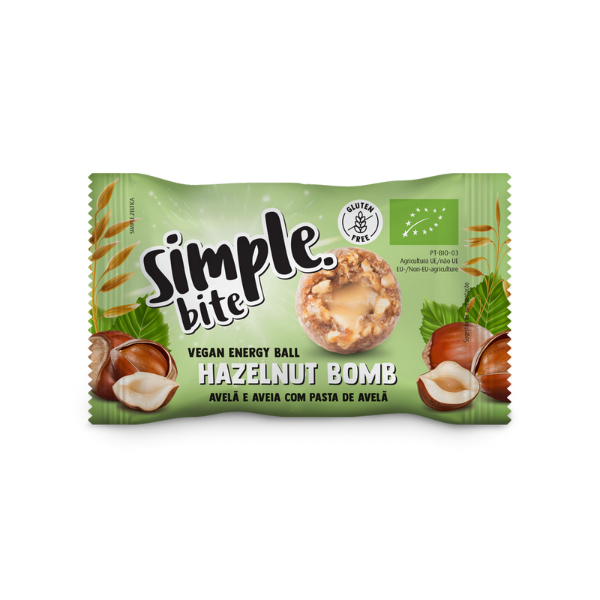 Bola energética com avelã, aveia e recheada com pasta de avelã. As Bolas Energéticas Simple® Bite Avelã e Aveia são uma bomba de sabor com um cremoso recheio de pasta de avelã. Feitas a partir de uma cuidada seleção de frutos secos, aveia e adoçadas com agave, são a pausa perfeita para a correria do dia a dia. Compostas por ingredientes 100% naturais e biológicos, são isentas de glúten, aptas para veganos e têm alto teor em fibra. São uma solução saudável, prática e muito saborosa para um snack que pode levar para todo o lado.